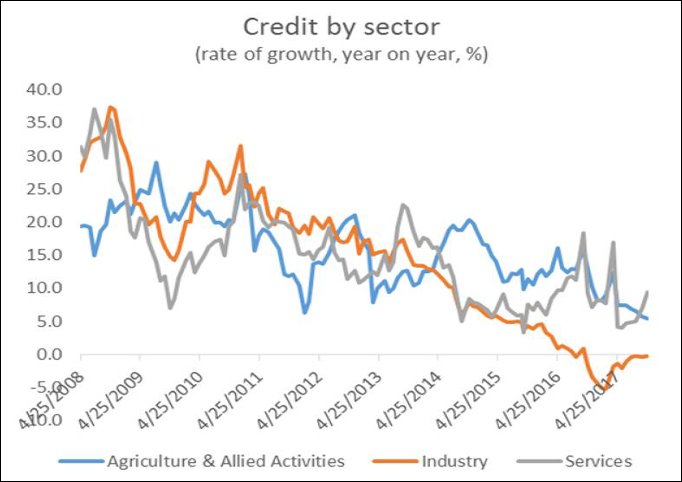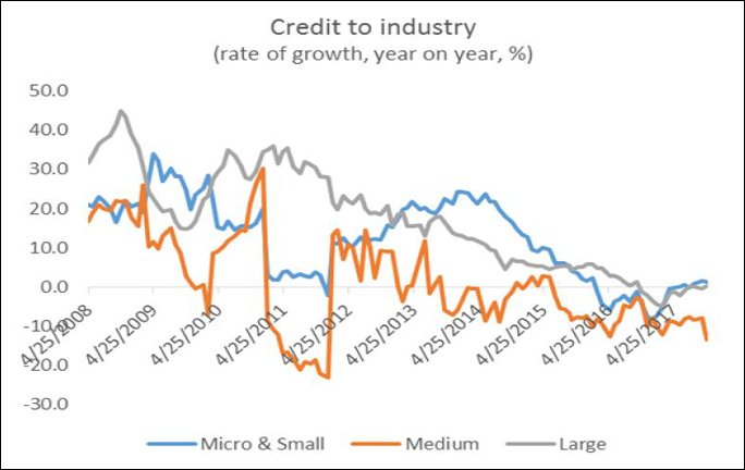 Large enterprises receive more than 82 per cent of total bank credit to industry. It is for this sub sector that the deceleration of growth followed by absolute decline is the clearest. From an annual rate of growth of 18 per cent in September 2013, bank credit to such enterprises decelerated continuously, to stagnate at rates of around 5 per cent for much of 2015 and 2016, then fell further to near zero expansion in August and September 2016. It turned negative the following month, fell sharply in January and February 2017 and has been negative since. In other words, for all the months of the past year, large industry has received smaller amounts of bank credit relative to the same months of the previous year.